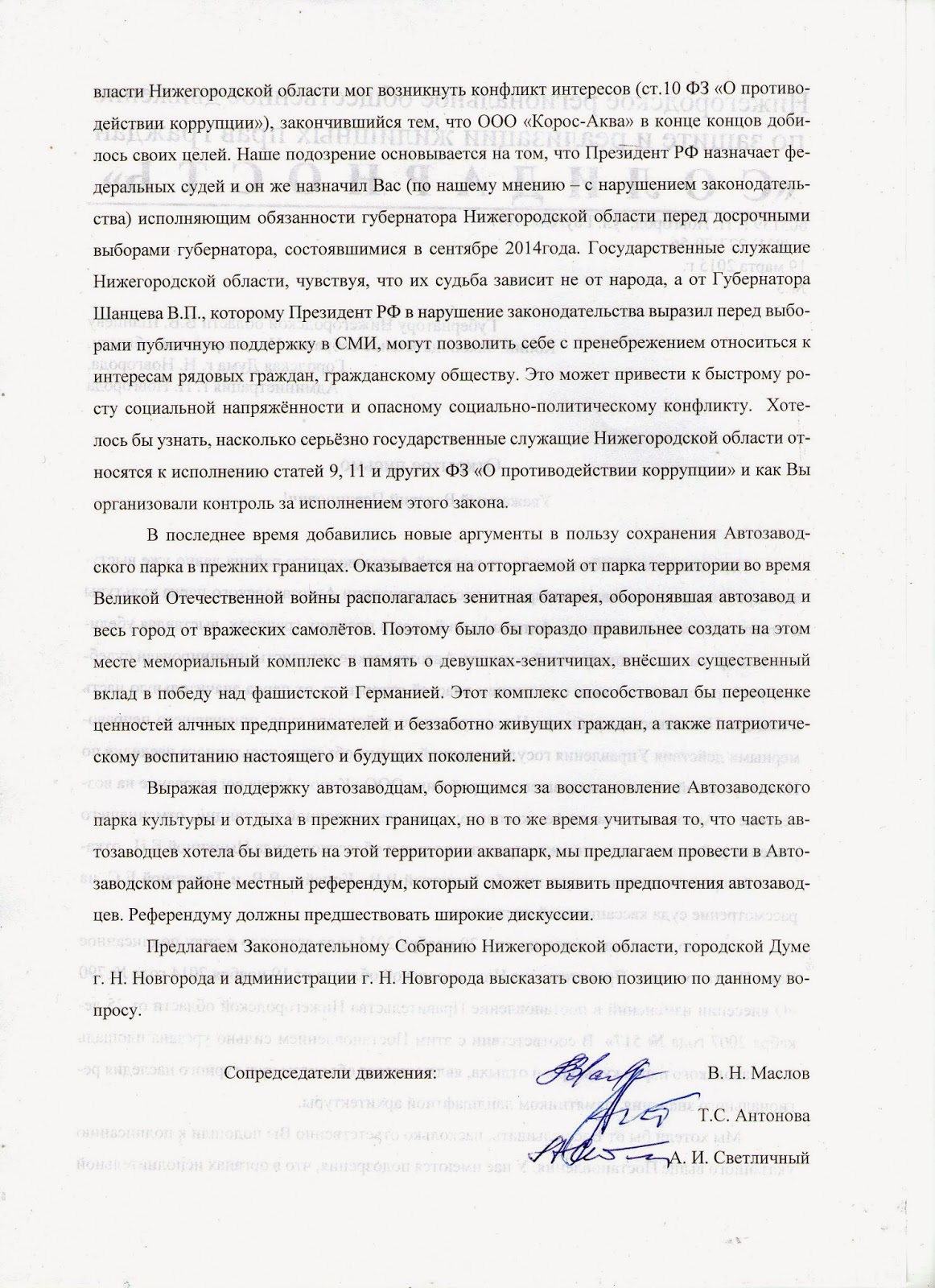 власти Нижегородской области мог возникнуть конфликт интересов (ст. 10 ФЗ «О противодействии коррупции»), закончившийся тем, что ООО «Корос-Аква» в конце концов добилось своих целей. Наше подозрение основывается на том, что Президент РФ назначает федеральных судей и он же назначил Вас (по нашему мнению - с нарушением законодательства) исполняющим обязанности губернатора Нижегородской области перед досрочными выборами губернатора, состоявшимися в сентябре 2014года. Государственные служащие Нижегородской области, чувствуя, что их судьба зависит не от народа, а от Губернатора Шанцева В.П., которому Президент РФ в нарушение законодательства выразил перед выборами публичную поддержку в СМИ, могут позволить себе с пренебрежением относиться к интересам рядовых граждан, гражданскому обществу. Это может привести к быстрому росту социальной напряжённости и опасному социально-политическому конфликту. Хотелось бы узнать, насколько серьёзно государственные служащие Нижегородской области относятся к исполнению статей 9, 11 и других ФЗ «О противодействии коррупции» и как Вы организовали контроль за исполнением этого закона.